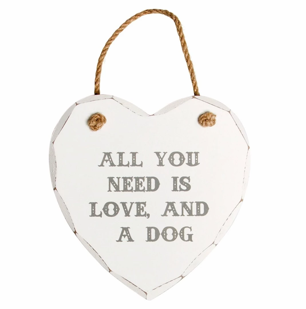 Sometimes, a wooden heart plaque can say it best. Hung with jute, this decoration is made from white painted wood and features the quote ‘All you need is love and a Dog’ in a beautiful grey typography.