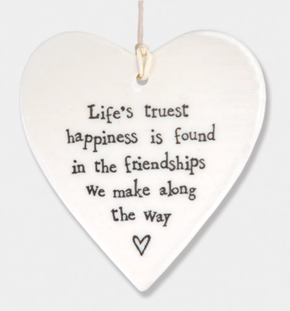 This lovely porcelain heart from East of India has a slightly rippled surface with an embossed message and a white string to hang it up with. Constantly one of our best sellers, these hearts make a perfect gift.