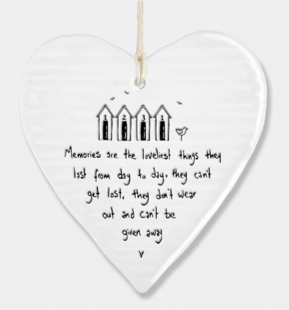 This lovely porcelain heart from East of India has a slightly rippled surface with an embossed message and a white string to hang it up with. Constantly one of our best sellers, these hearts make a perfect gift.