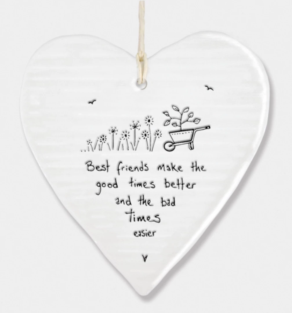 This lovely porcelain heart from East of India has a slightly rippled surface with an embossed message and a white string to hang it up with. Constantly one of our best sellers, these hearts make a perfect gift.