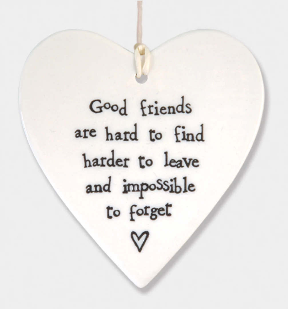 This lovely porcelain heart from East of India has a slightly rippled surface with an embossed message and a white string to hang it up with. Constantly one of our best sellers, these hearts make a perfect gift.