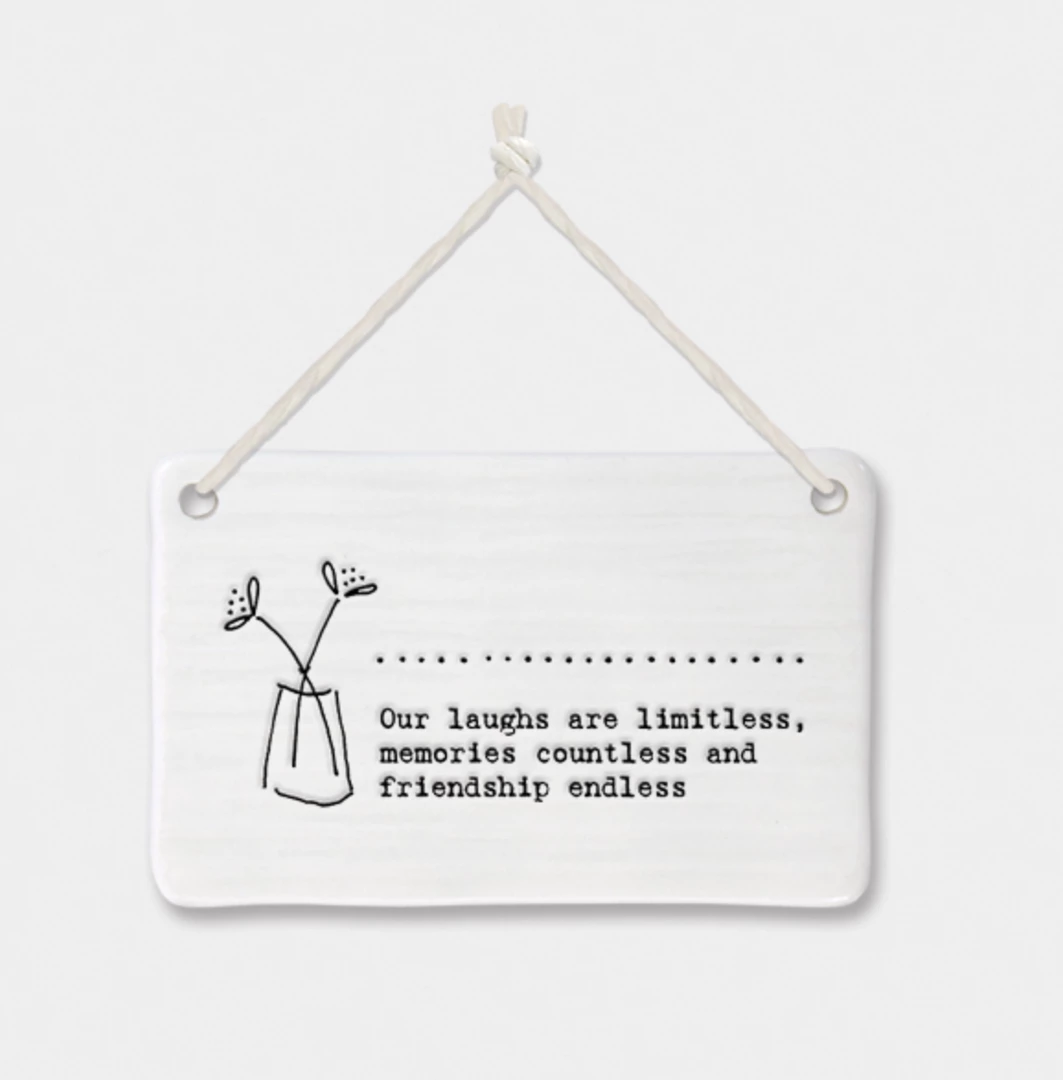 This lovely porcelain hanging sign from East of India has a slightly rippled surface with an embossed message and a white string to hang it up with. Constantly one of our best sellers, these signs make a perfect gift.