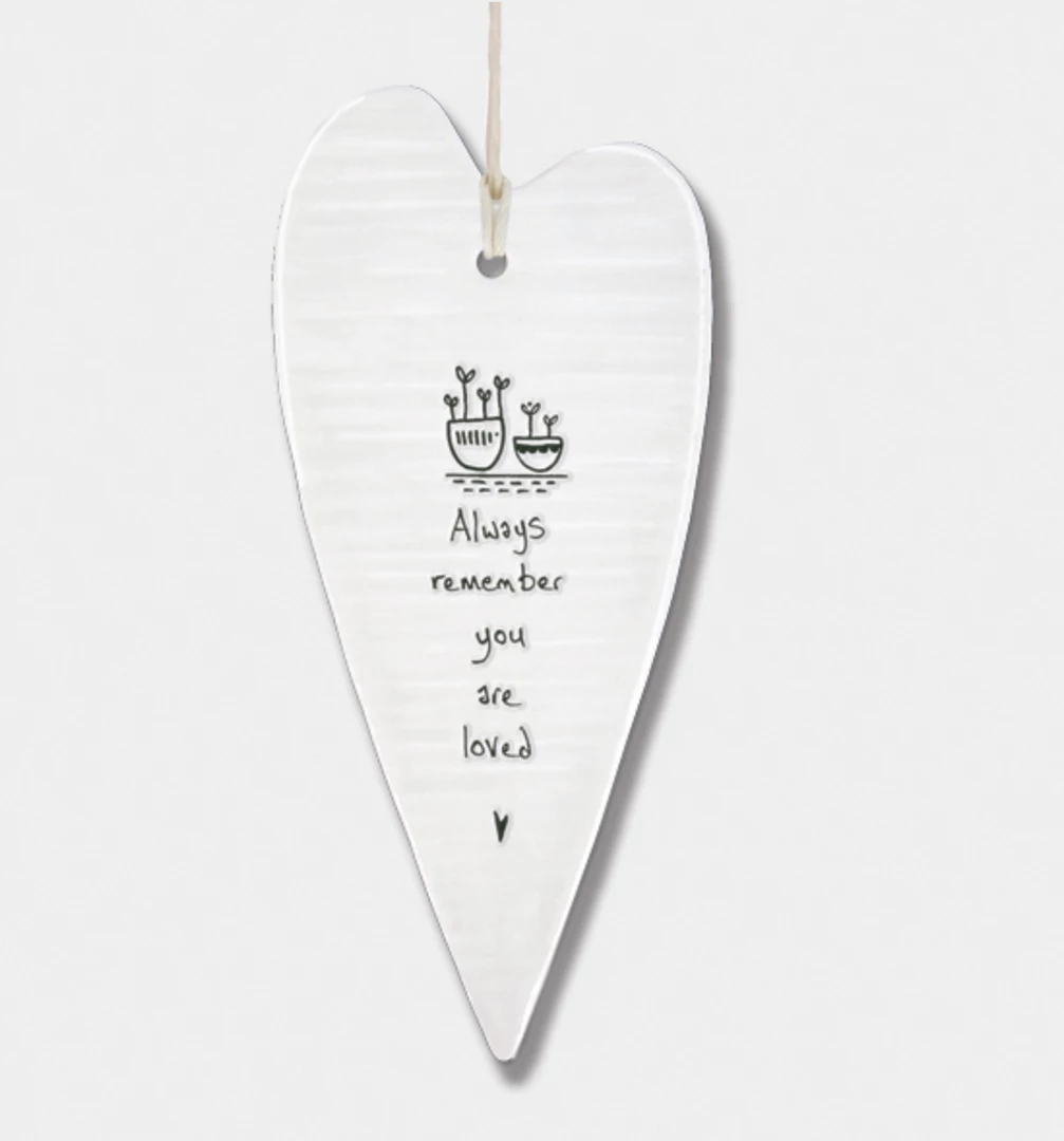 This lovely porcelain heart from East of India has a slightly rippled surface with an embossed message and a white string to hang it up with. Constantly one of our best sellers, these hearts make a perfect gift.