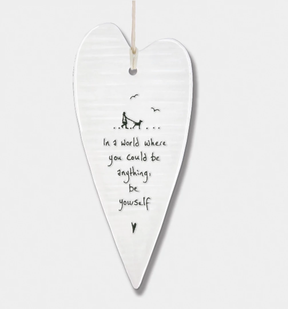 This lovely porcelain heart from East of India has a slightly rippled surface with an embossed message and a white string to hang it up with. Constantly one of our best sellers, these hearts make a perfect gift.