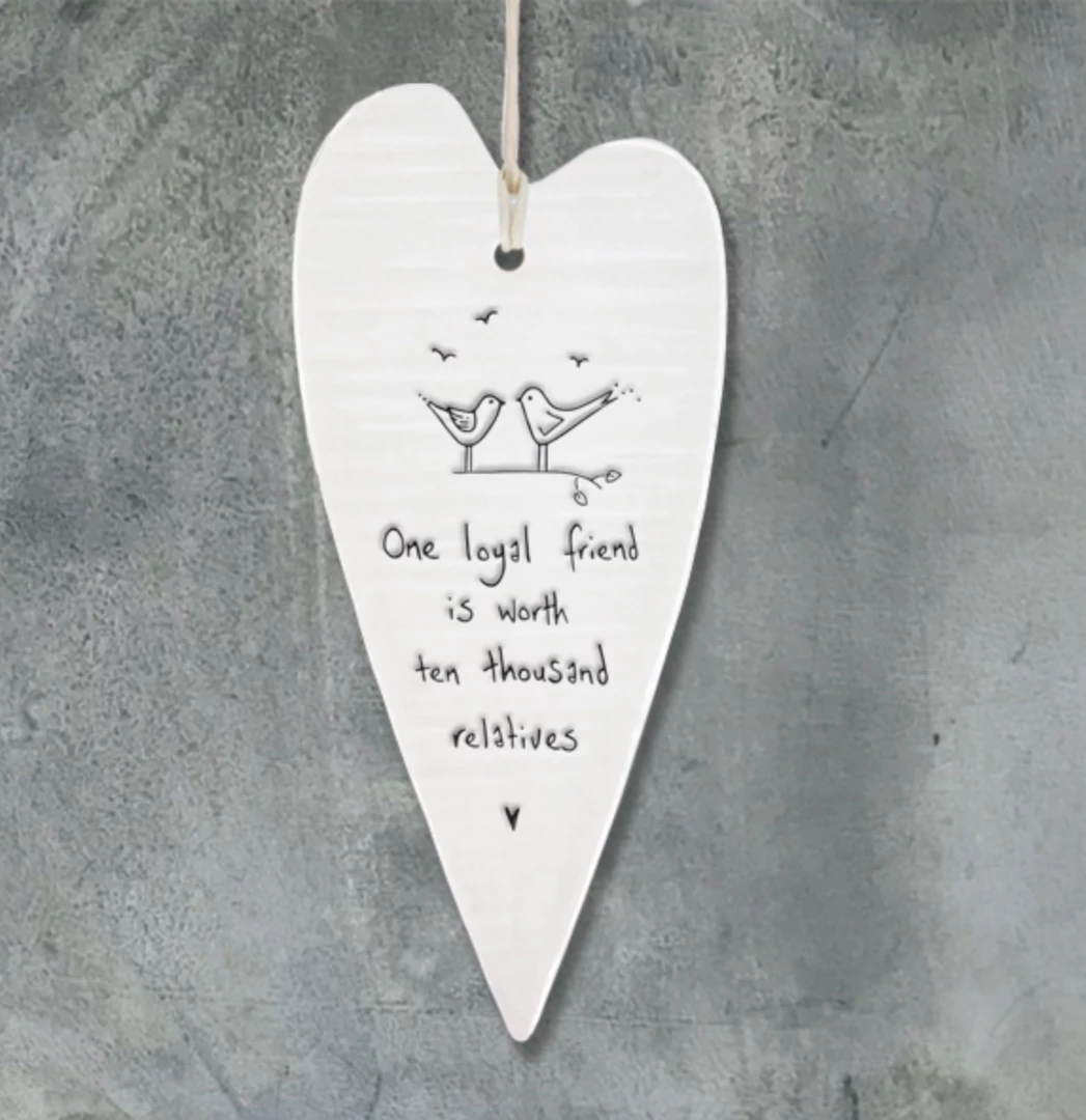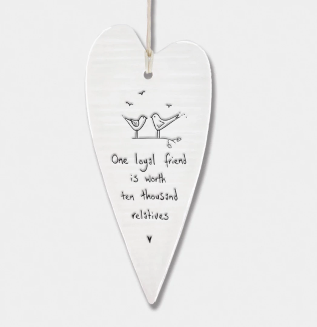 This lovely porcelain heart from East of India has a slightly rippled surface with an embossed message and a white string to hang it up with. Constantly one of our best sellers, these hearts make a perfect gift.