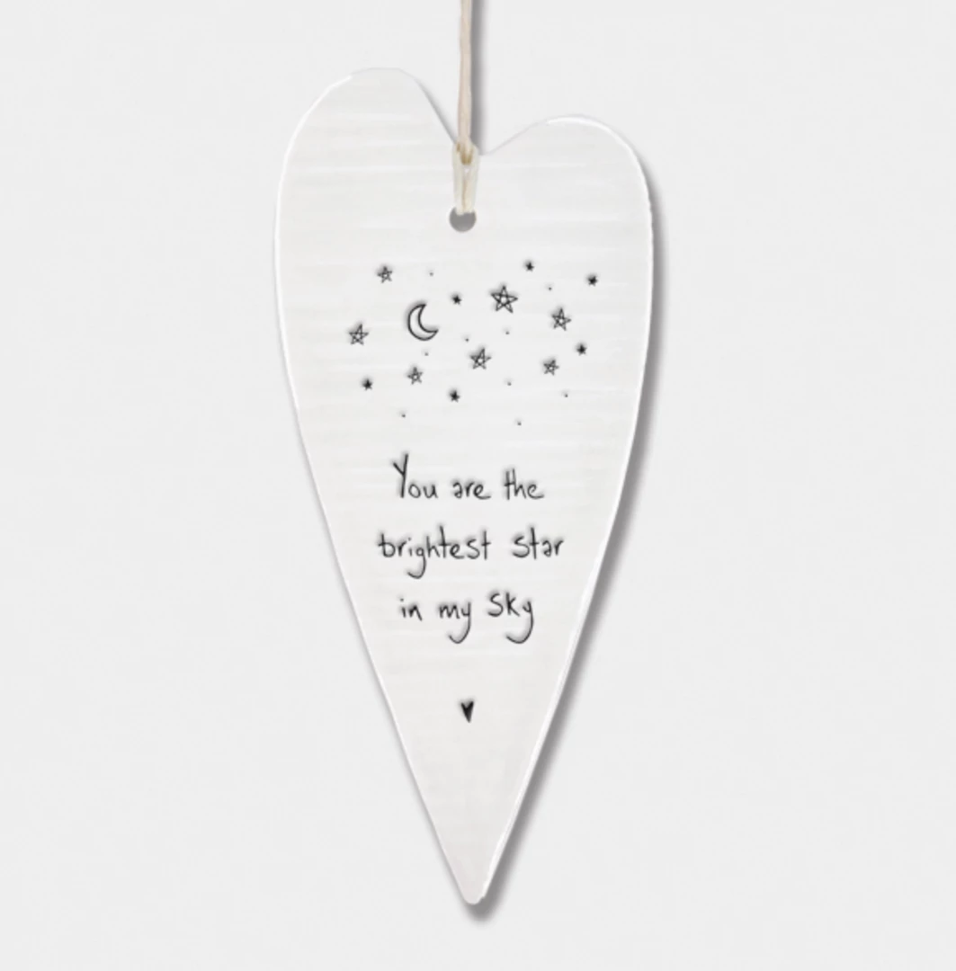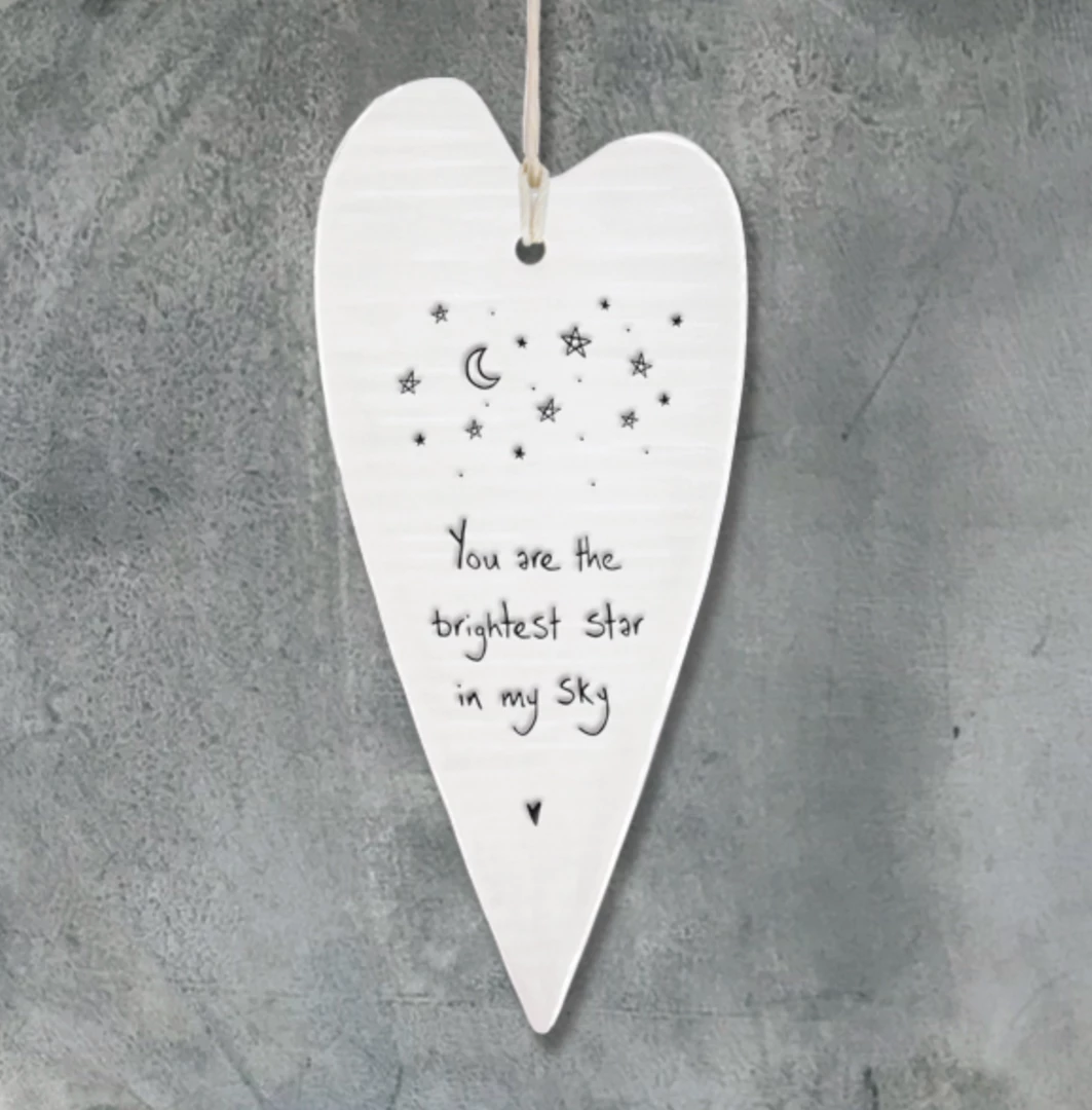 This lovely porcelain heart from East of India has a slightly rippled surface with an embossed message and a white string to hang it up with. Constantly one of our best sellers, these hearts make a perfect gift.
