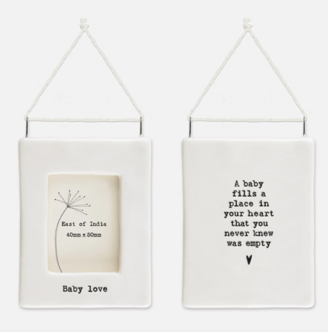 This cute little porcelain frame from East of India has the message “Baby Love” on the front and “A baby fills a place in your heart that you never knew was empty“ embossed on the back. Comes in it’s own brown cardboard box with the message also on the front of the box. Easy to post and a gorgeous gift.