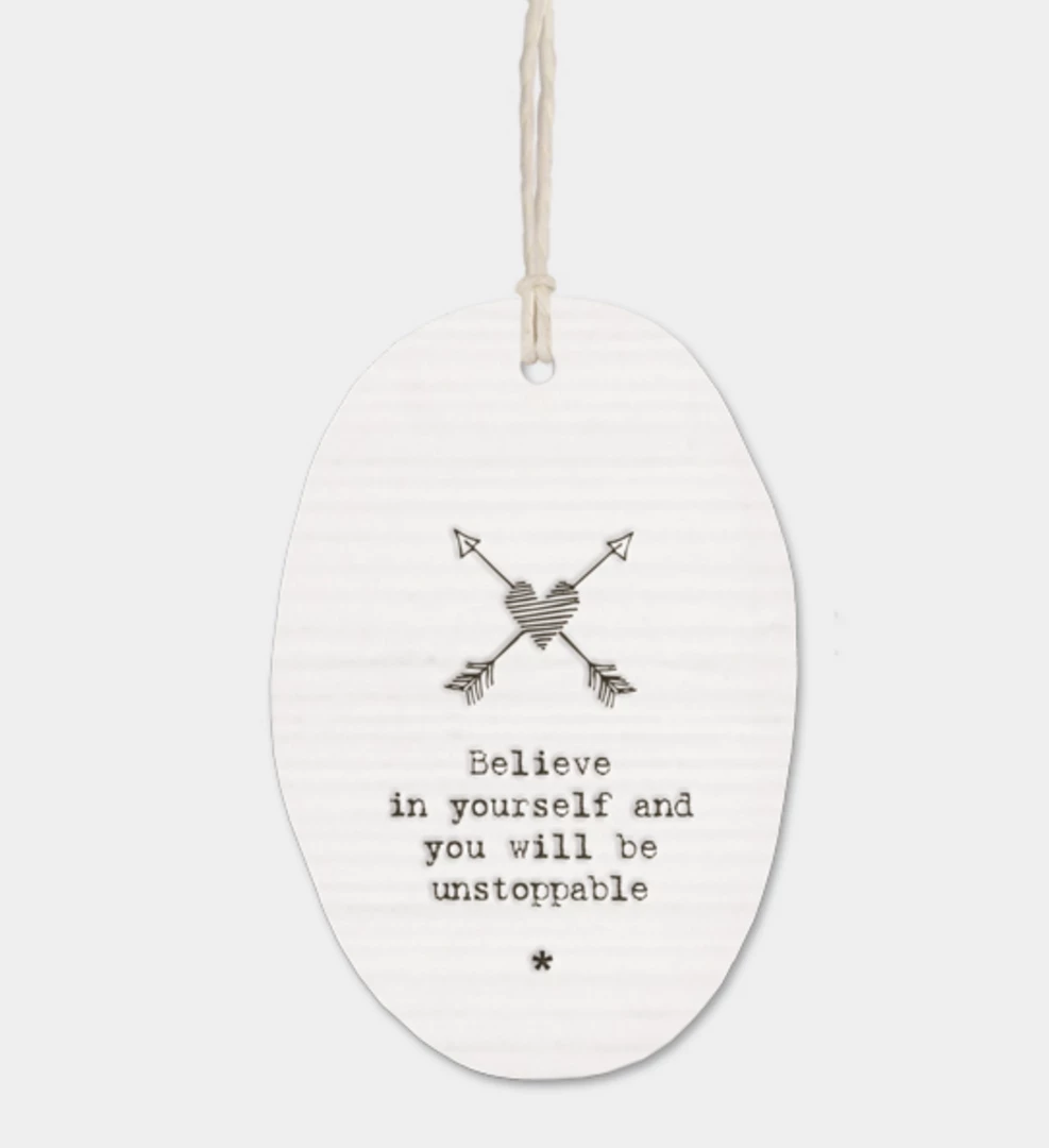 This lovely little oval porcelain hanger from East of India has a slightly rippled surface with an embossed message “Believe in yourself and you will be unstoppable”. Constantly one of our best sellers, these hangers make a perfect gift.