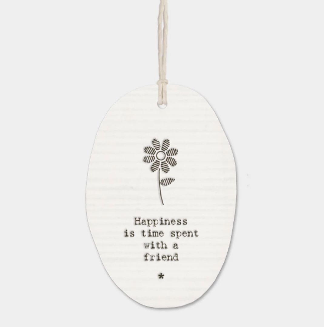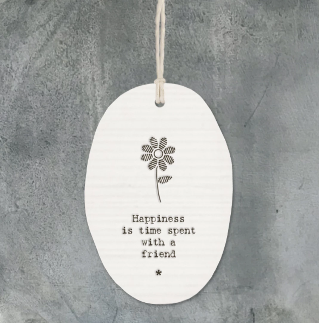 This lovely little oval porcelain hanger from East of India has a slightly rippled surface with an embossed message. Constantly one of our best sellers, these hangers make a perfect gift.