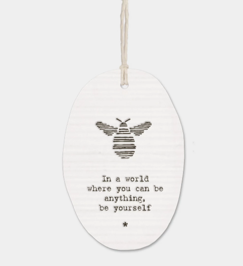 This lovely little oval porcelain hanger from East of India has a slightly rippled surface with an embossed message “In a world where you can be anything, be yourself”. Constantly one of our best sellers, these hangers make a perfect gift.