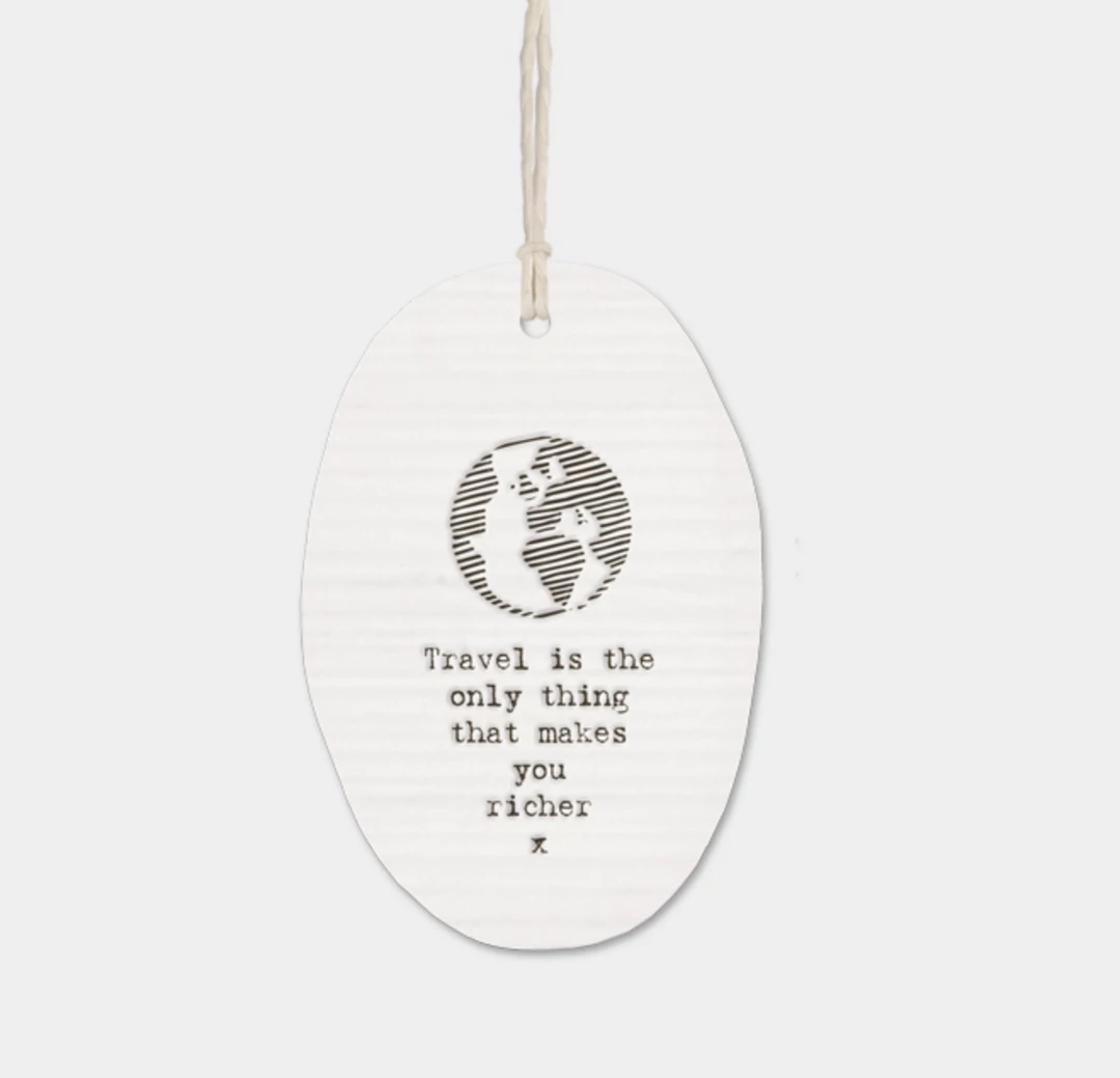 This lovely little oval porcelain hanger from East of India has a slightly rippled surface with an embossed message “Travel is the only thing that makes you richer “. Constantly one of our best sellers, these hangers make a perfect gift.