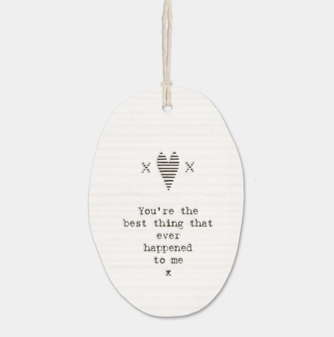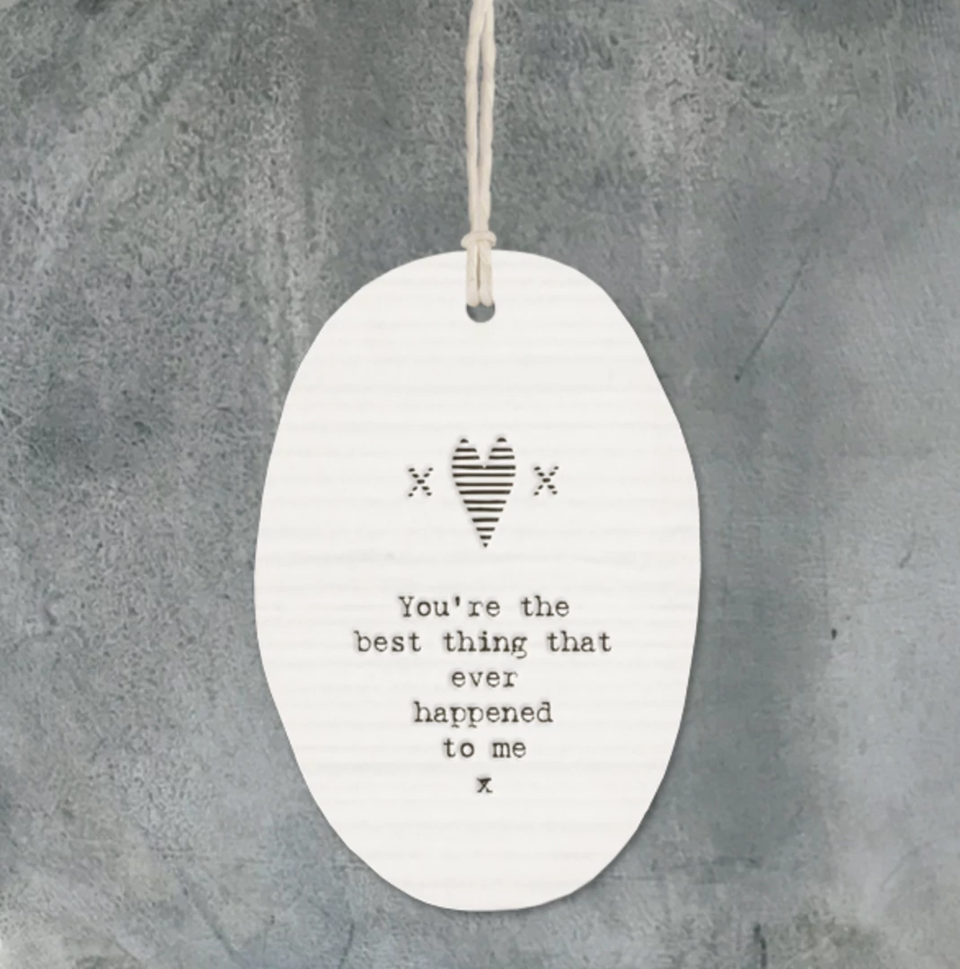 This lovely little oval porcelain hanger from East of India has a slightly rippled surface with an embossed message. Constantly one of our best sellers, these hangers make a perfect gift.