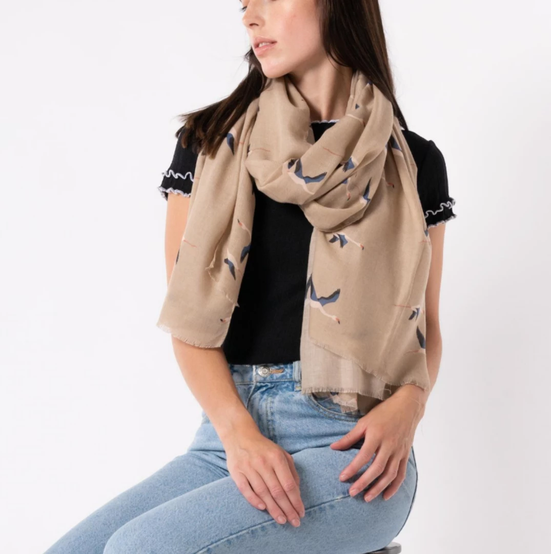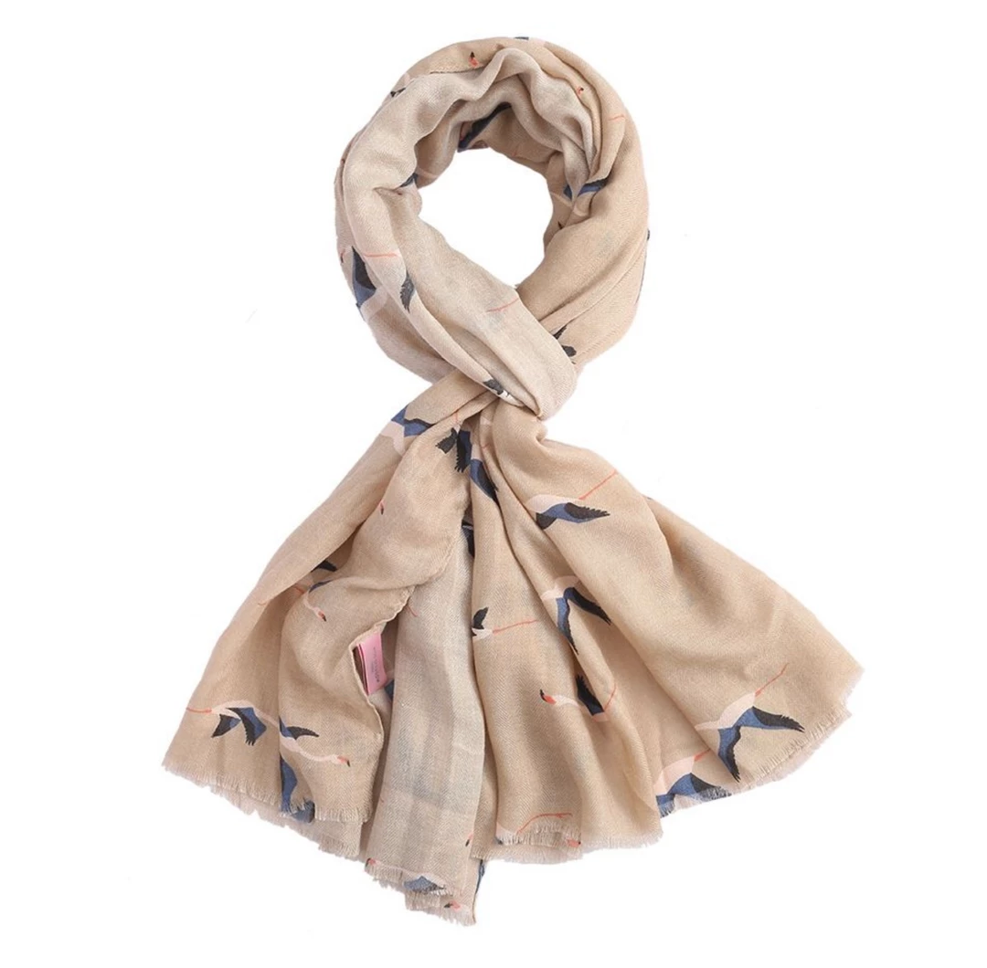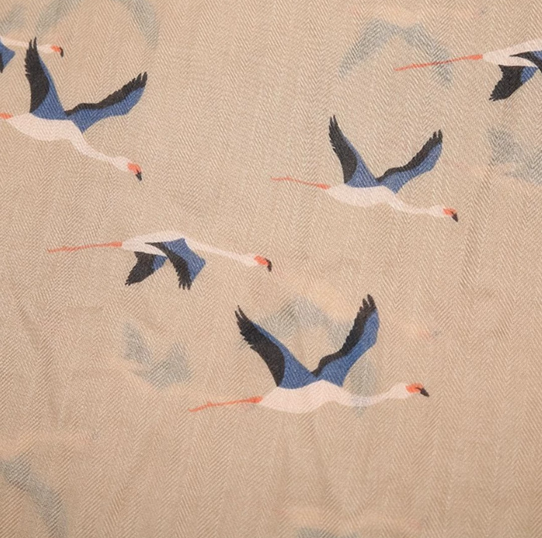 Flying flamingos print scarf on a beige background made from a soft and light fabric