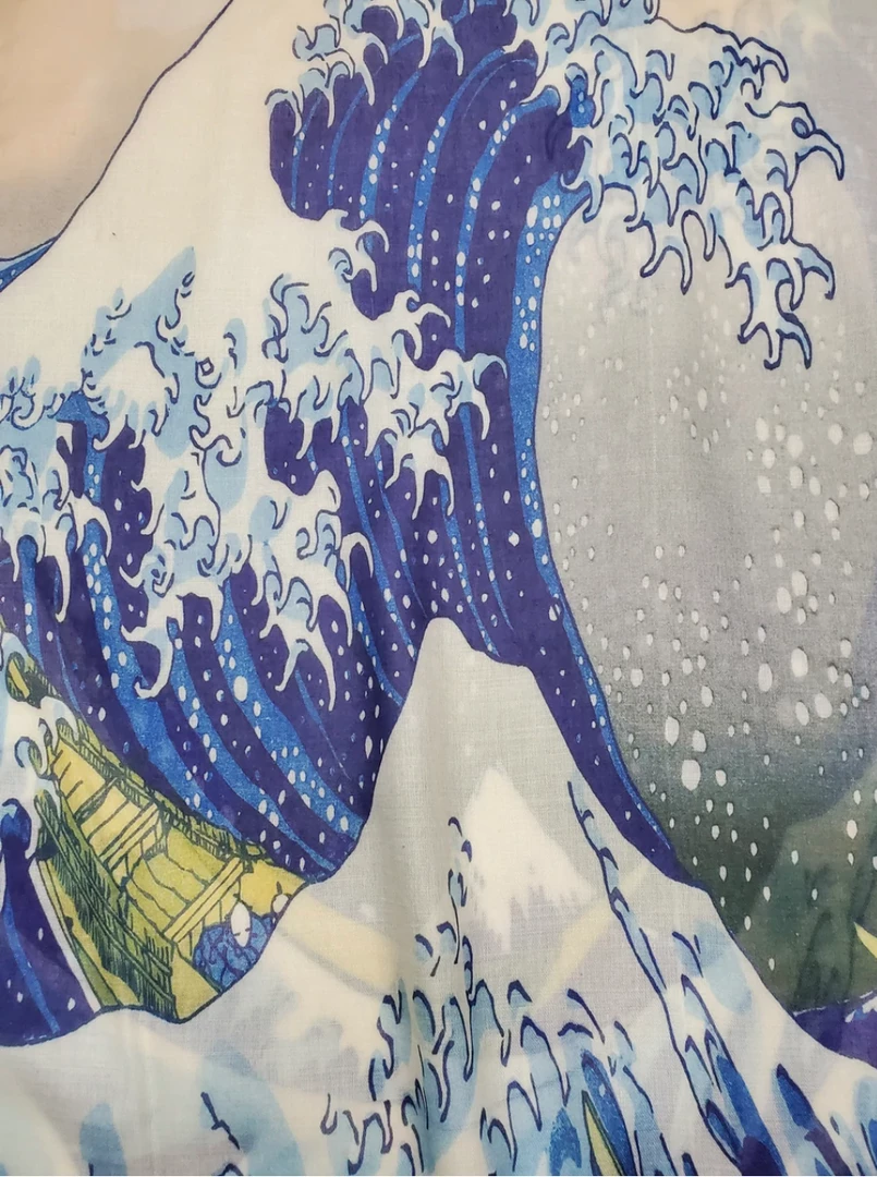 A beautiful soft scarf featuring the famous great wave by Japanese artist Hokusai symbolizing the irresistible force of nature.