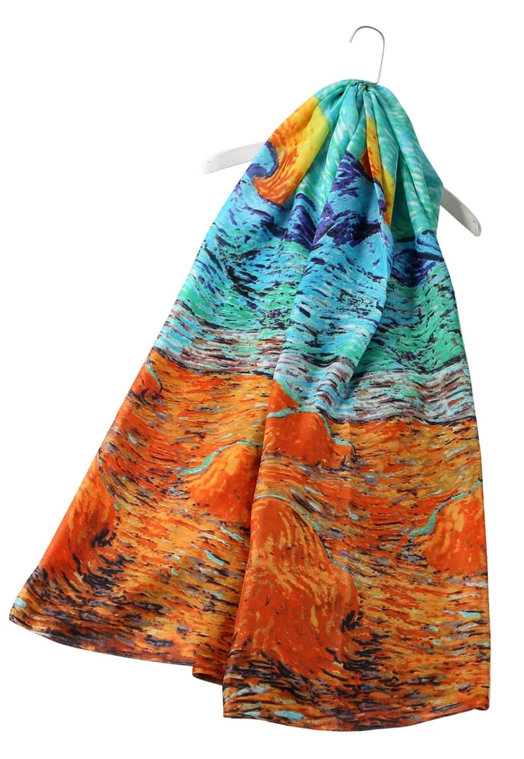 Treat yourself to a touch of genuine luxury with this beautiful pure silk scarf, featuring a design inspired by an Impressionist Sunset Oil Painting.