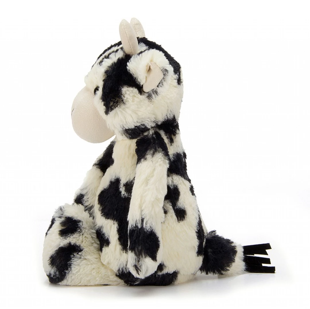 Scrumping apples? Not Bashful Calf. She’s a daisy-munching, kooky little cow, who enjoys listening to songs about farm life. With her soft white horns and lovely splotchy fur, she’s so happy she jumped over the moon!