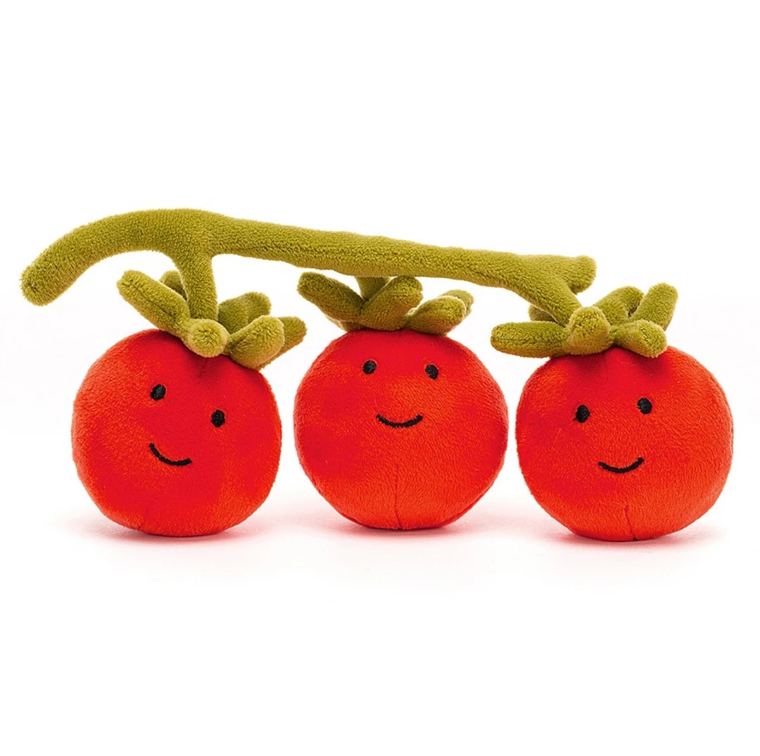 Join the greenhouse party! The Vivacious Vegetable Tomato pals are a giggly gang hanging out in the sun! Plump and stretchy in orangey-red, this tomato trio sit on a soft green vine. With soft green leaves and smiley faces, they’re the pick of the patch!