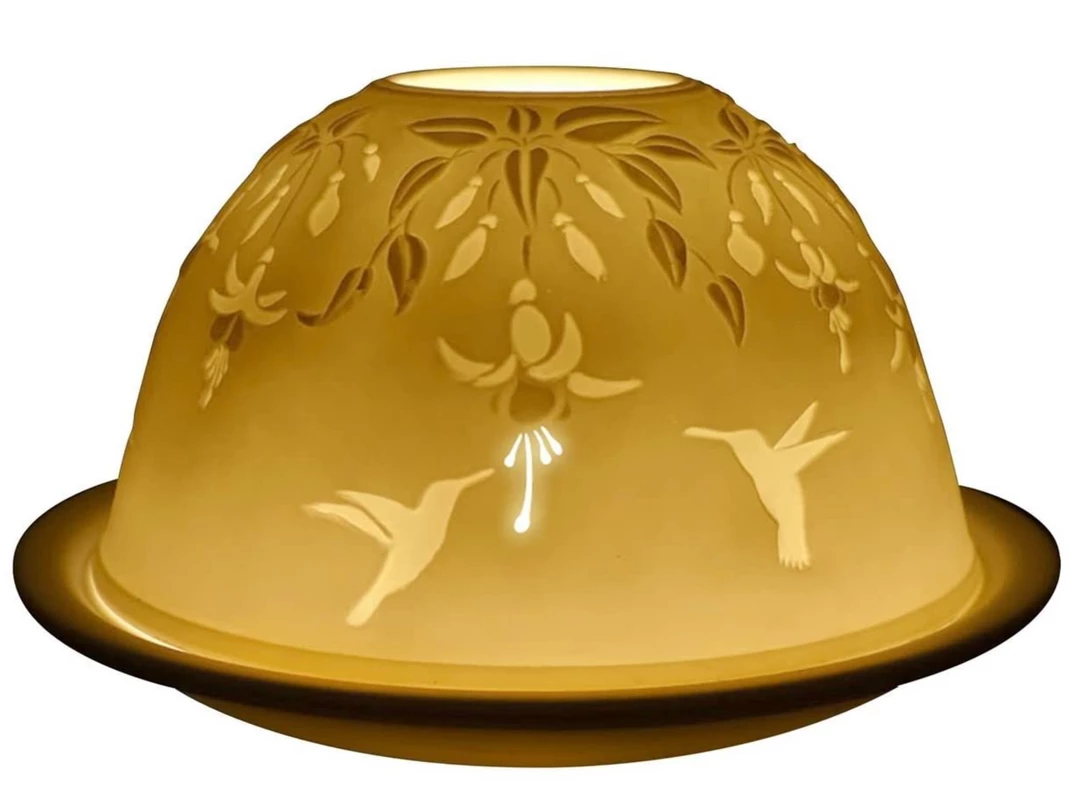 Lithophane is an etched or moulded artwork in thin very translucent porcelain that can only be seen fully when backlit, in this case a candle or LED light.