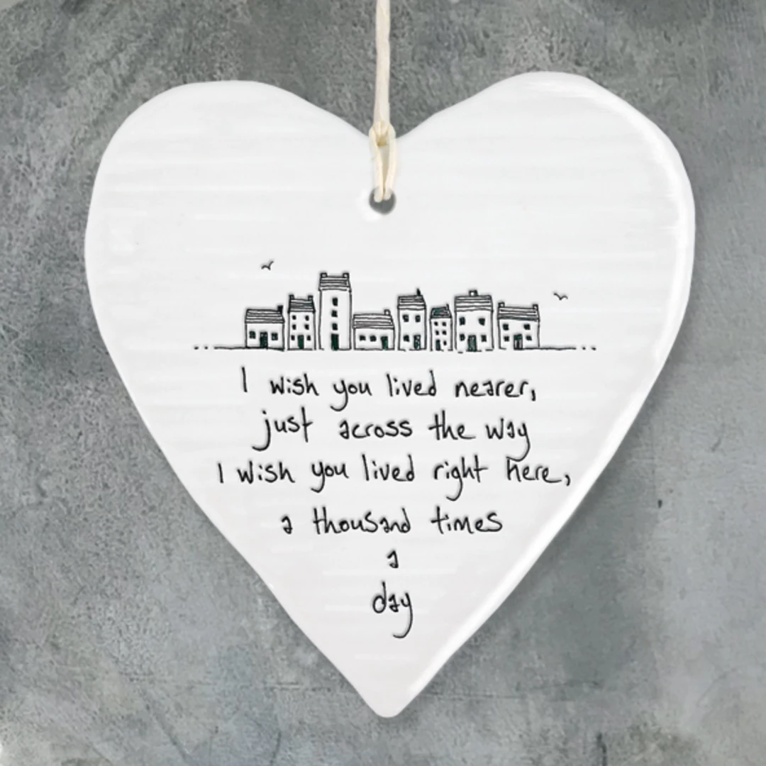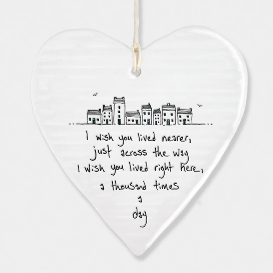 This lovely porcelain heart from East of India has a slightly rippled surface with an embossed message and a white string to hang it up with. Constantly one of our best sellers, these hearts make a perfect gift.