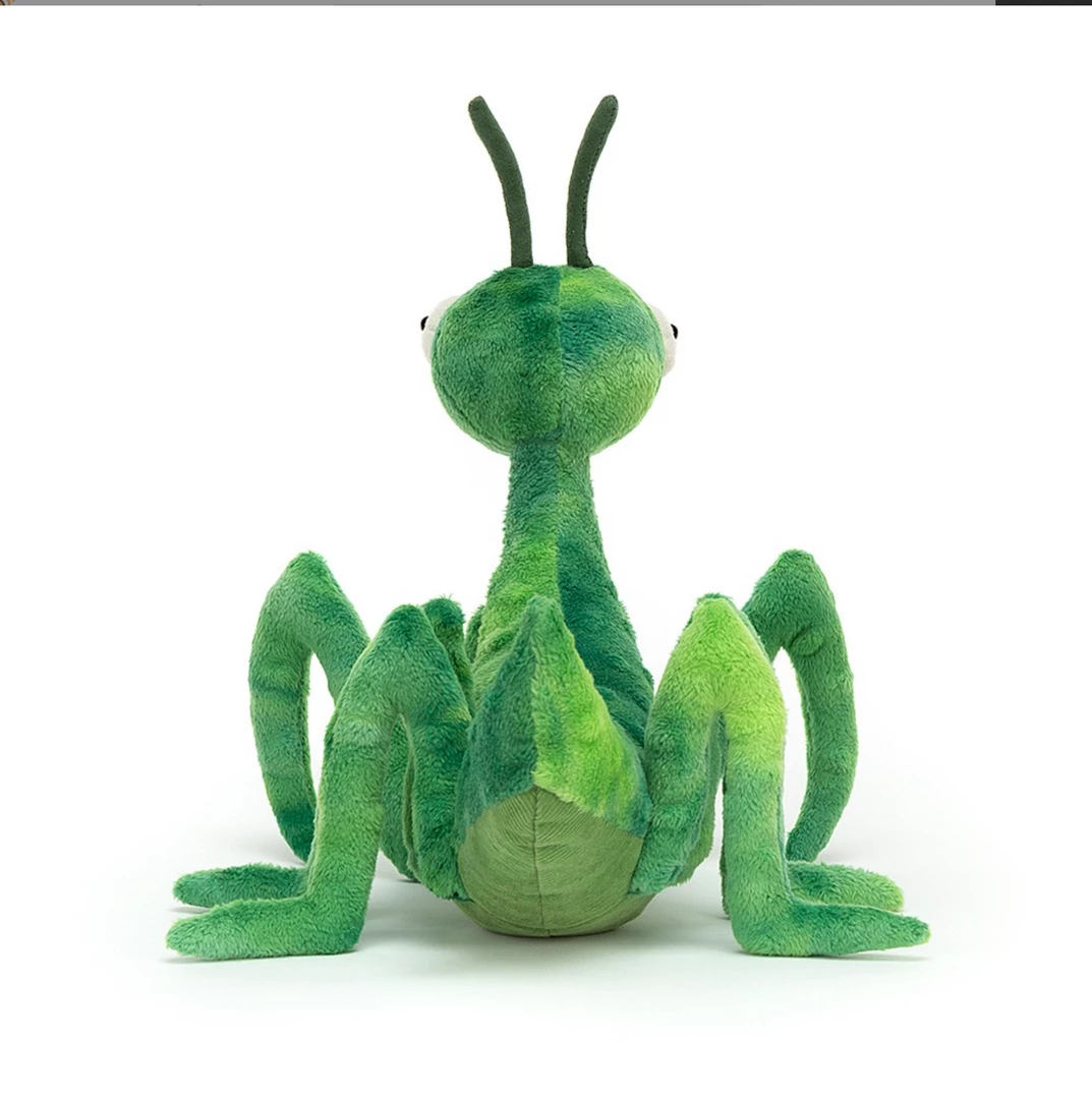 Penny Praying Mantis is a lovely jumble of legs, bug eyes and bendy body! With mottled fur in shades of emerald and pear, a fine cordy tummy and pert suedey feelers, this impish insect makes a dazzling companion – though she does sometimes get a bit discombobulated!