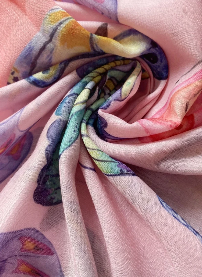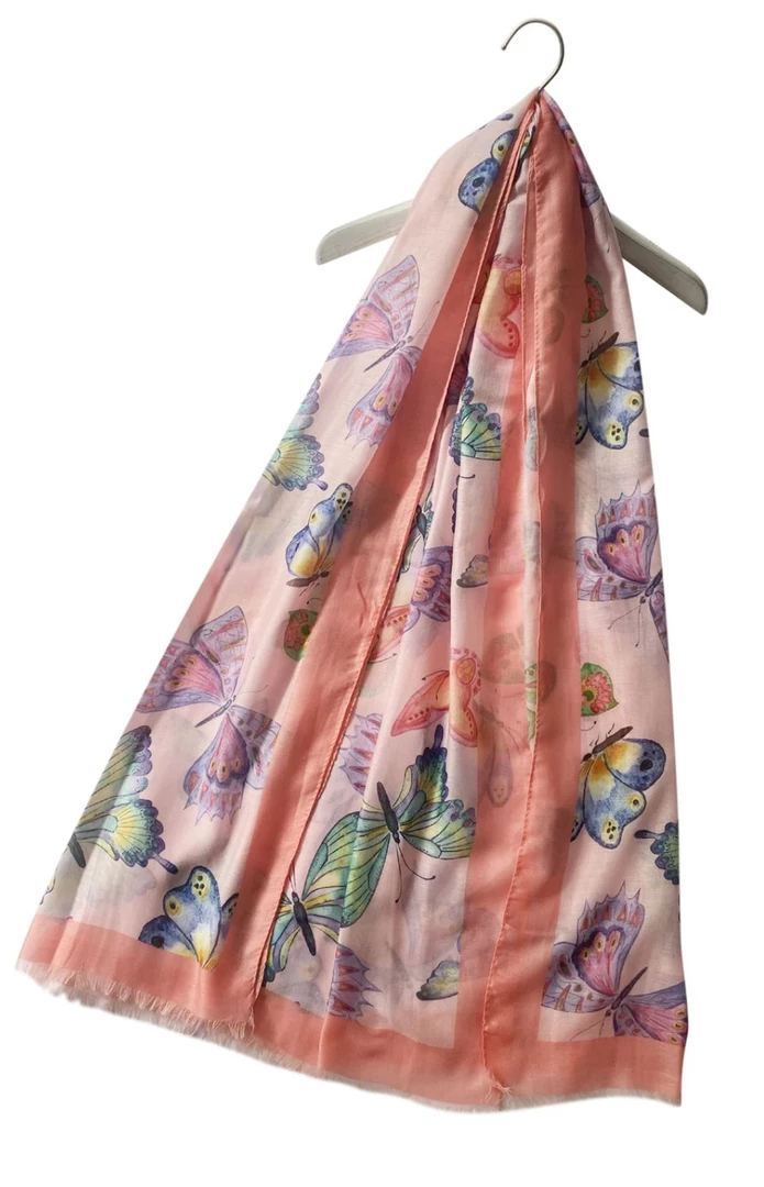 A bright and bold soft scarf featuring painted butterflies with a frayed edge hem. Perfect for brightening up an outfit for the summer!
