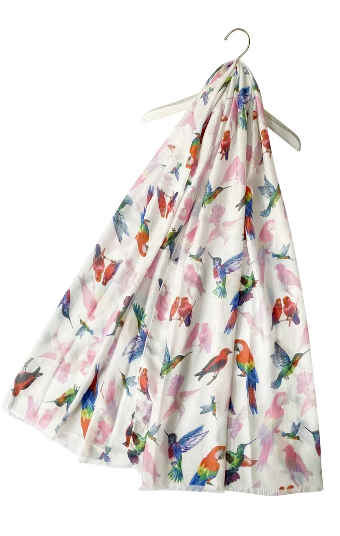A bright and bold soft scarf featuring parrots and hummingbirds with a frayed edge hem. Perfect for brightening up an outfit for the summer!