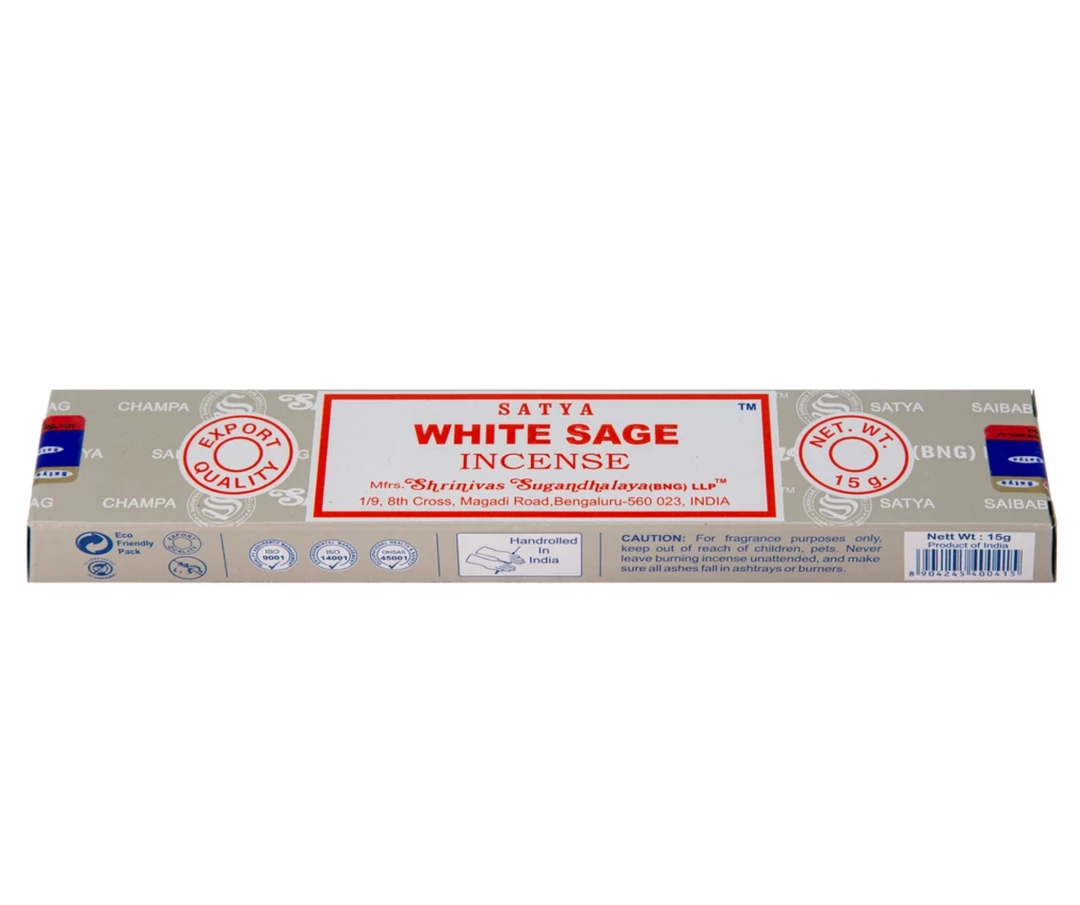 Protect your aura with the sacred scent of White Sage! Hand rolled in India from the Satya line of incense, this special floral and woody blend of essential oils helps to release and cleanse negativity energy from your space. Light it up and shelter your spirit in the sanctuary of this serene smoke!