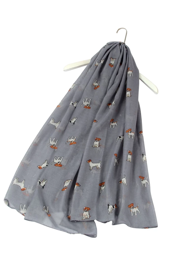 This scarf has printed Jack Russell dogs on a navy background and is super soft and light