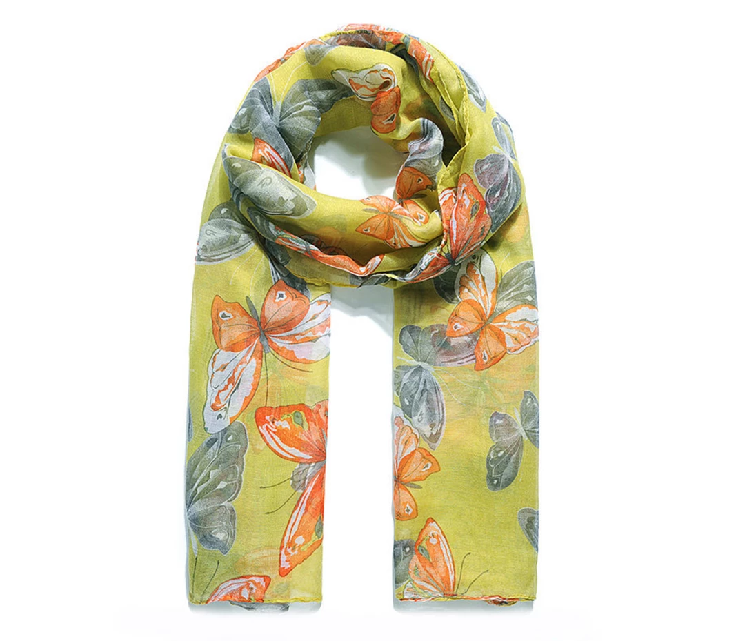This lovely butterfly print scarf in yellow ochre has orange and brown butterflies and is perfect for the spring!