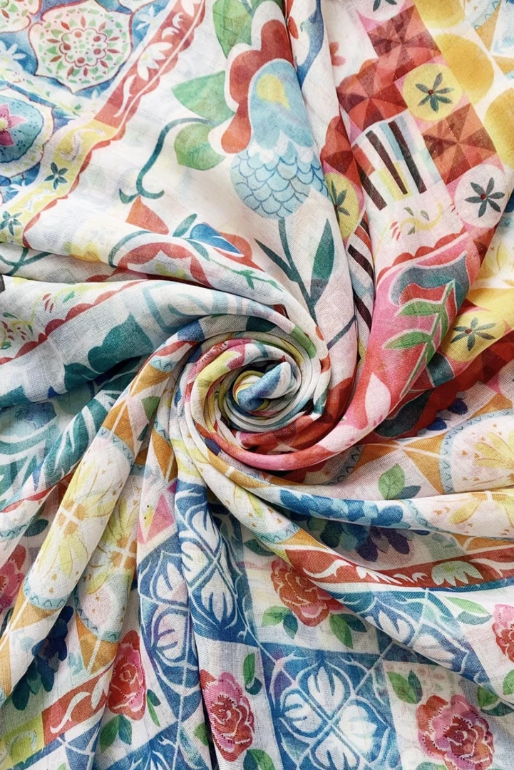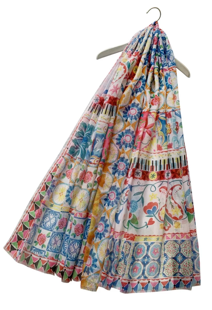 A bright and bold soft scarf featuring a gorgeous summery print with a frayed edge hem. Perfect for brightening up an outfit for the summer!