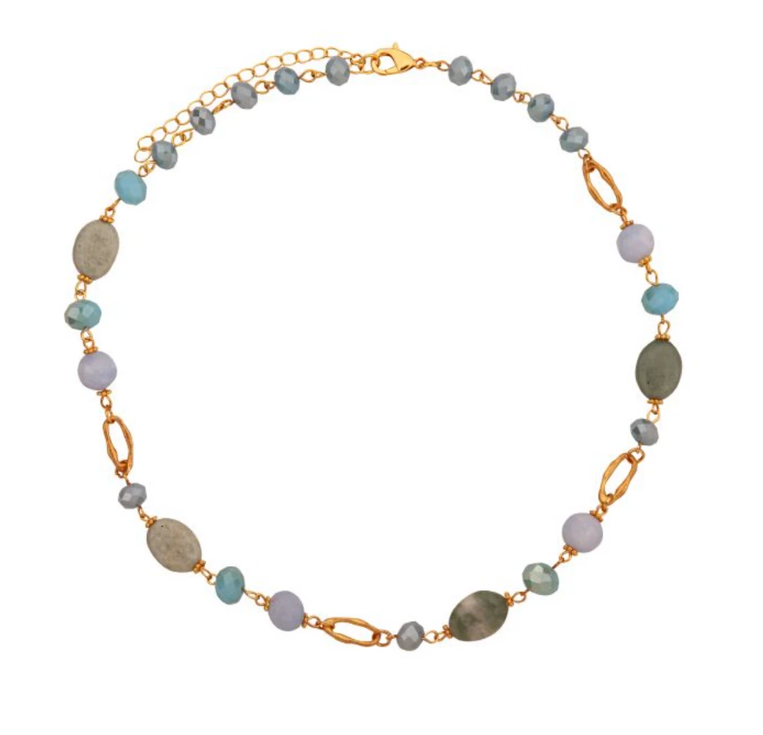 A gorgeous short necklace in gold coloured nickel free metal with natural crystals and semi precious stones in blue and turquoise tones.