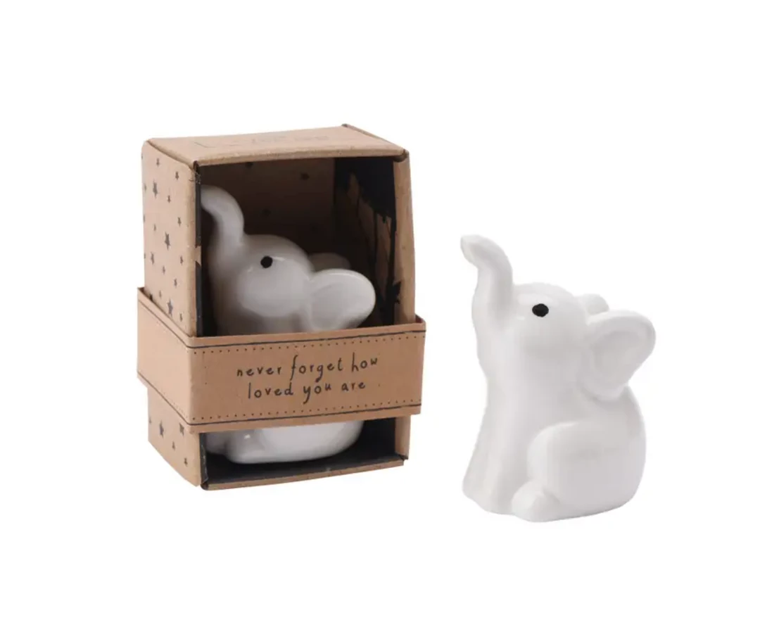 This sweet little ceramic elephant comes in a beautiful brown gift box with a wrapper which says “Never Forget How Loved You Are”
