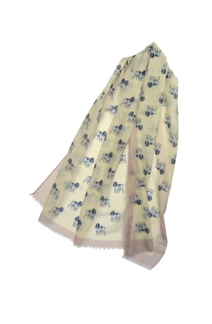 This soft beige scarf featuring Cocker Spaniel dogs has a frayed edge hem and contrast border. Beautifully soft and can also be worn as a wrap.