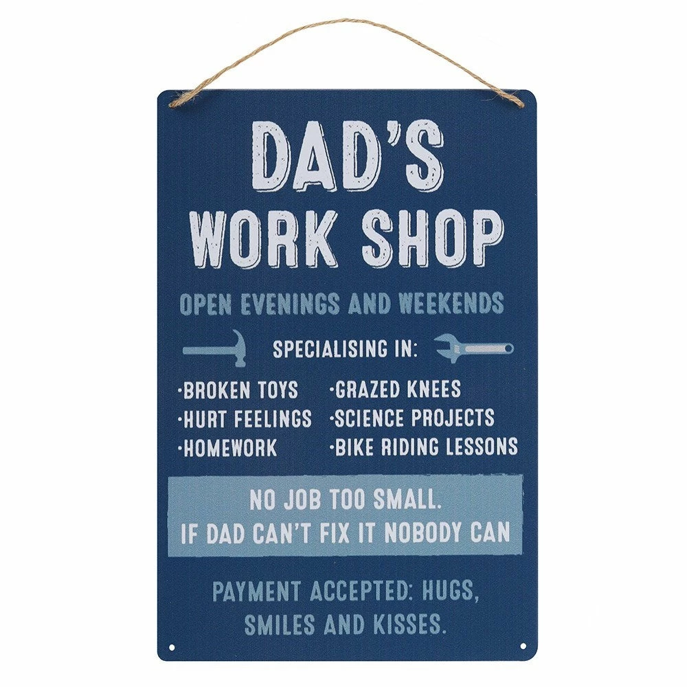 This fun metal sign is the perfect gift for Dad. Featuring the wording ‘Dad’s Workshop’ the sign has a list of all things that Dad can fix. The sign has a rope handle fixed to the top for easy hanging.