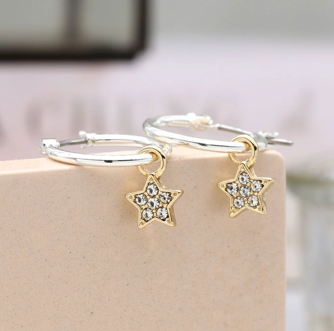 Silver plated hoop earrings with faux gold plated and pave crystal star charms
