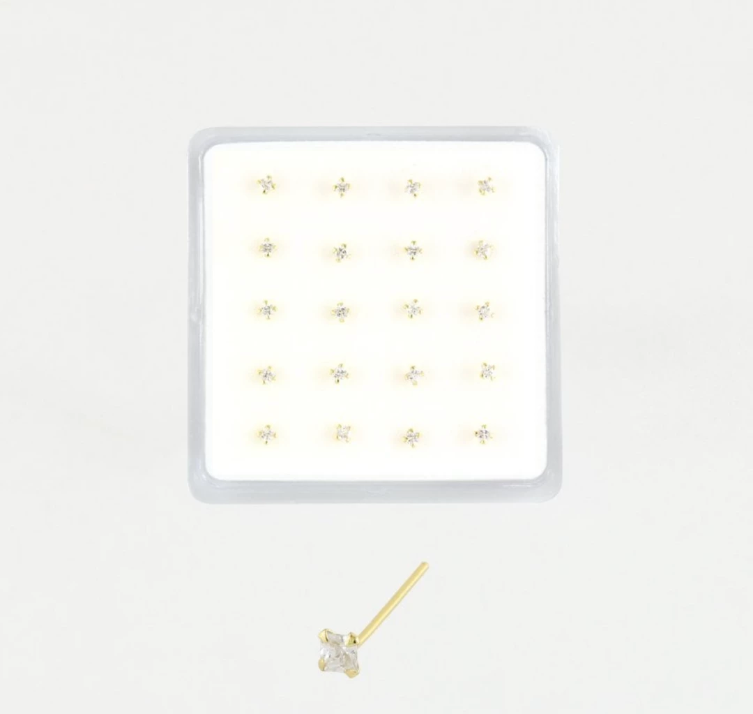Square clear gem nose pins in Gold plated Sterling Silver. These nose pins have a straight back.
