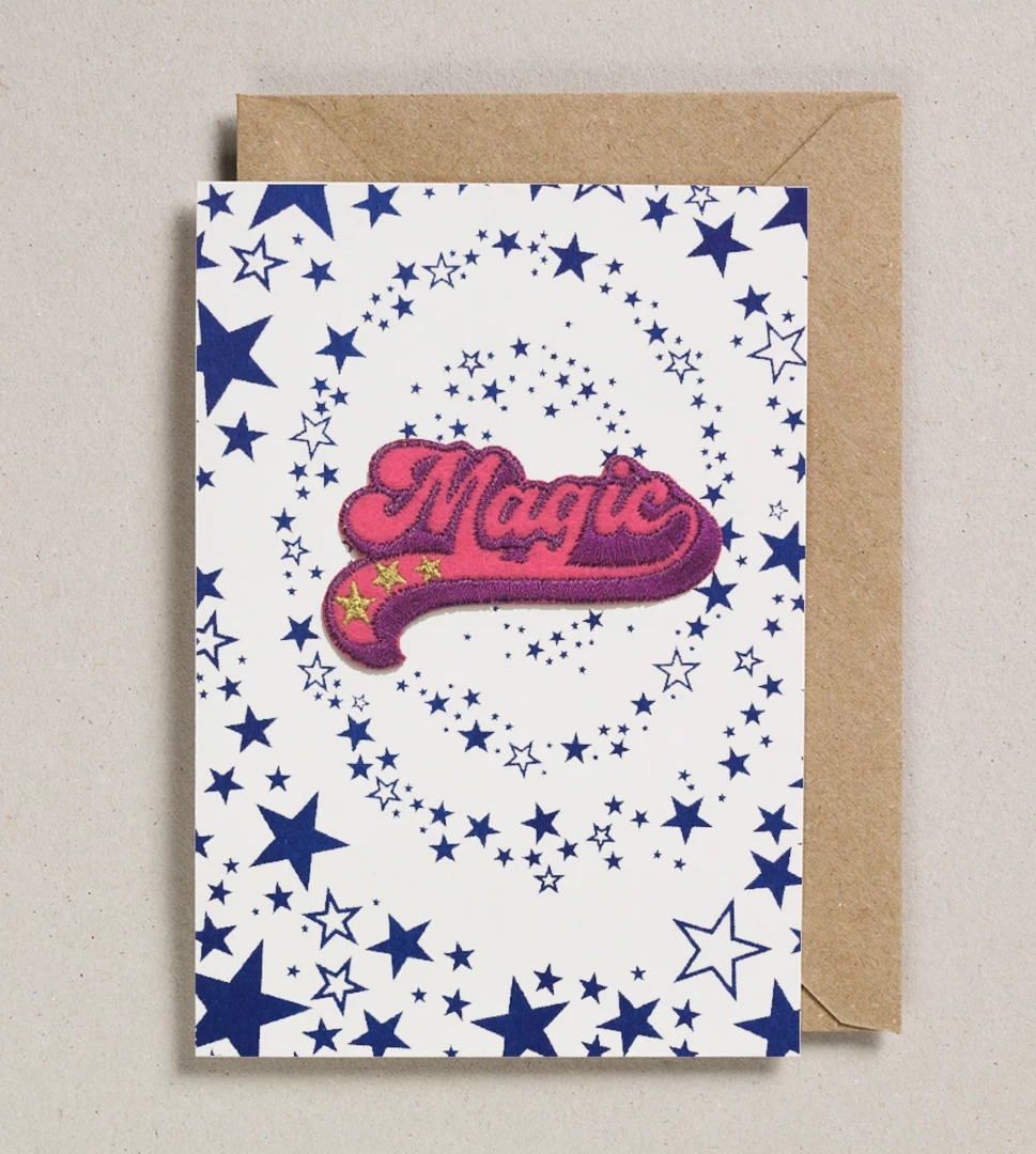 A richly embroidered colourful patch adorns these printed cards. The patch has an iron-on backing so can be removed from the card and ironed on to a favourite t-shirt, curtains or whatever you like!