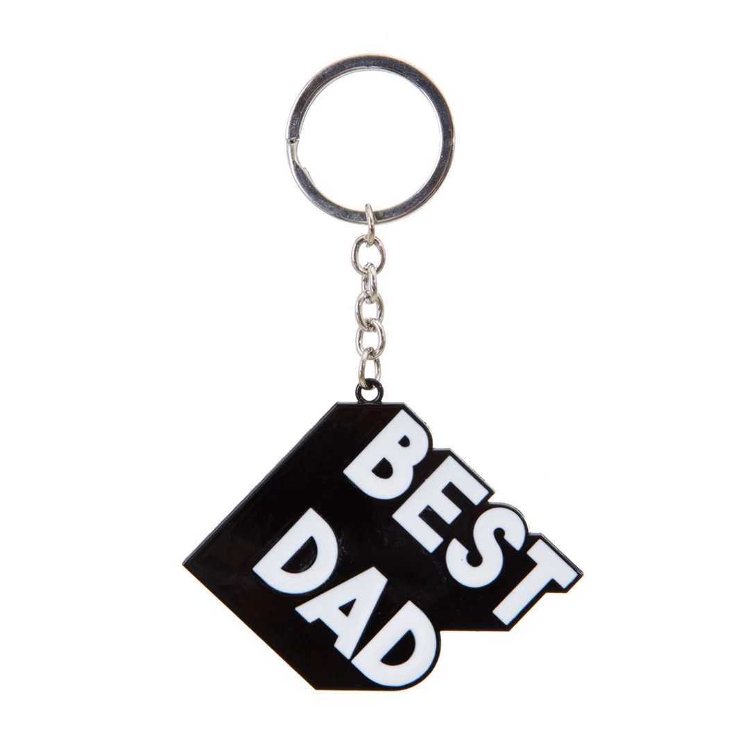 This Best Dad metal enamel keyring features a black and white design with friendly text.