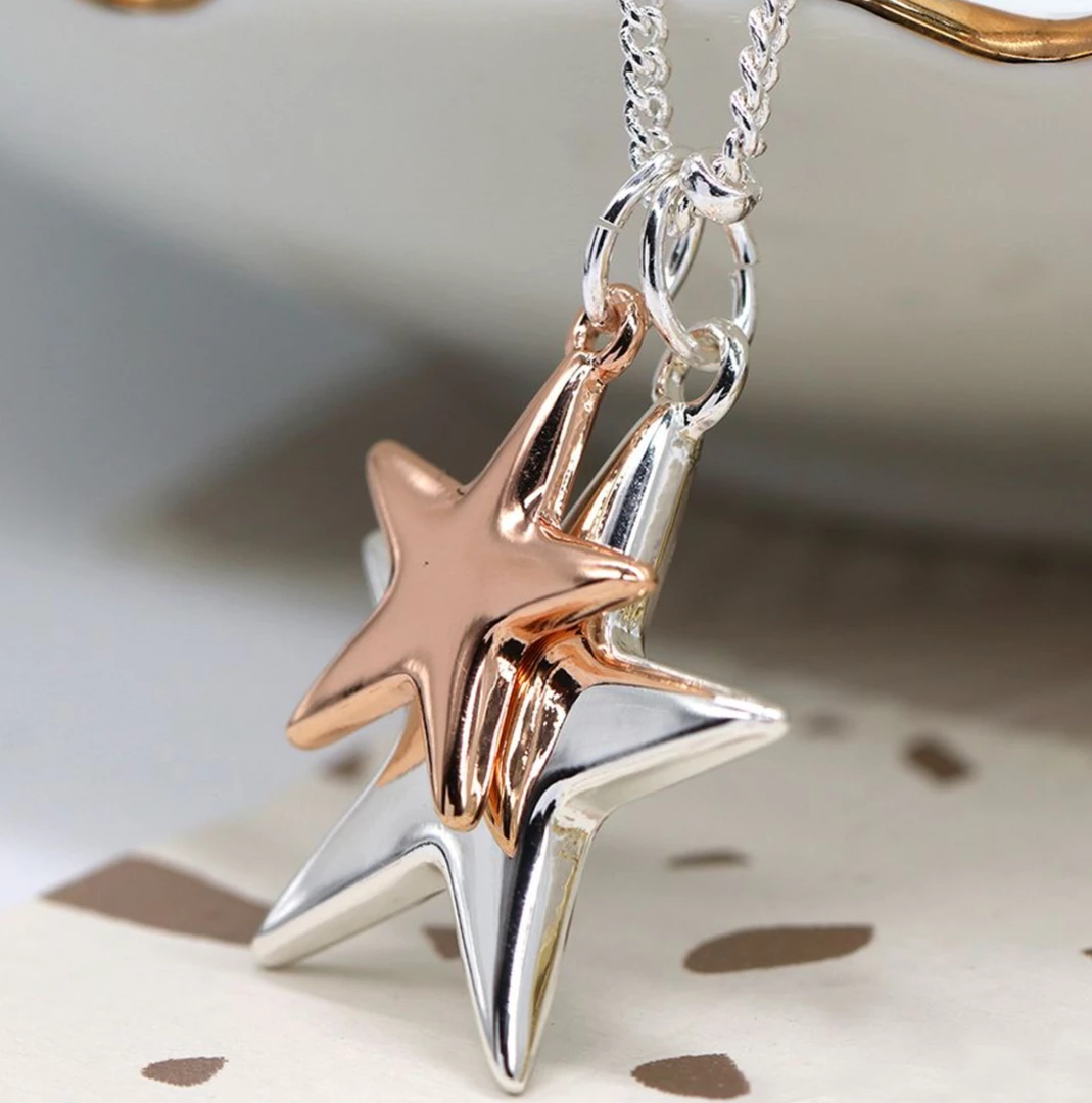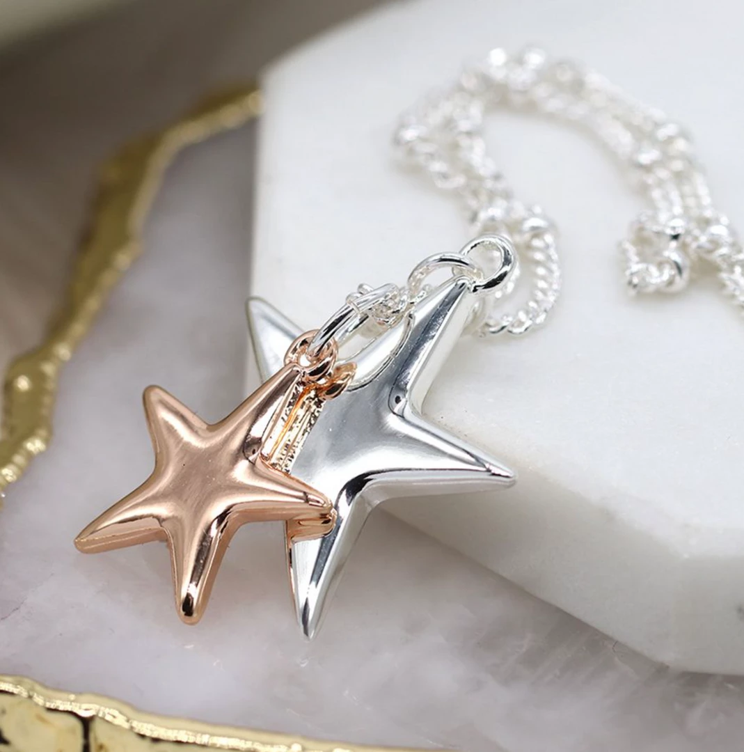 Double star necklace in contrasting rose gold and silver plated finishes on a fine silver plated chain