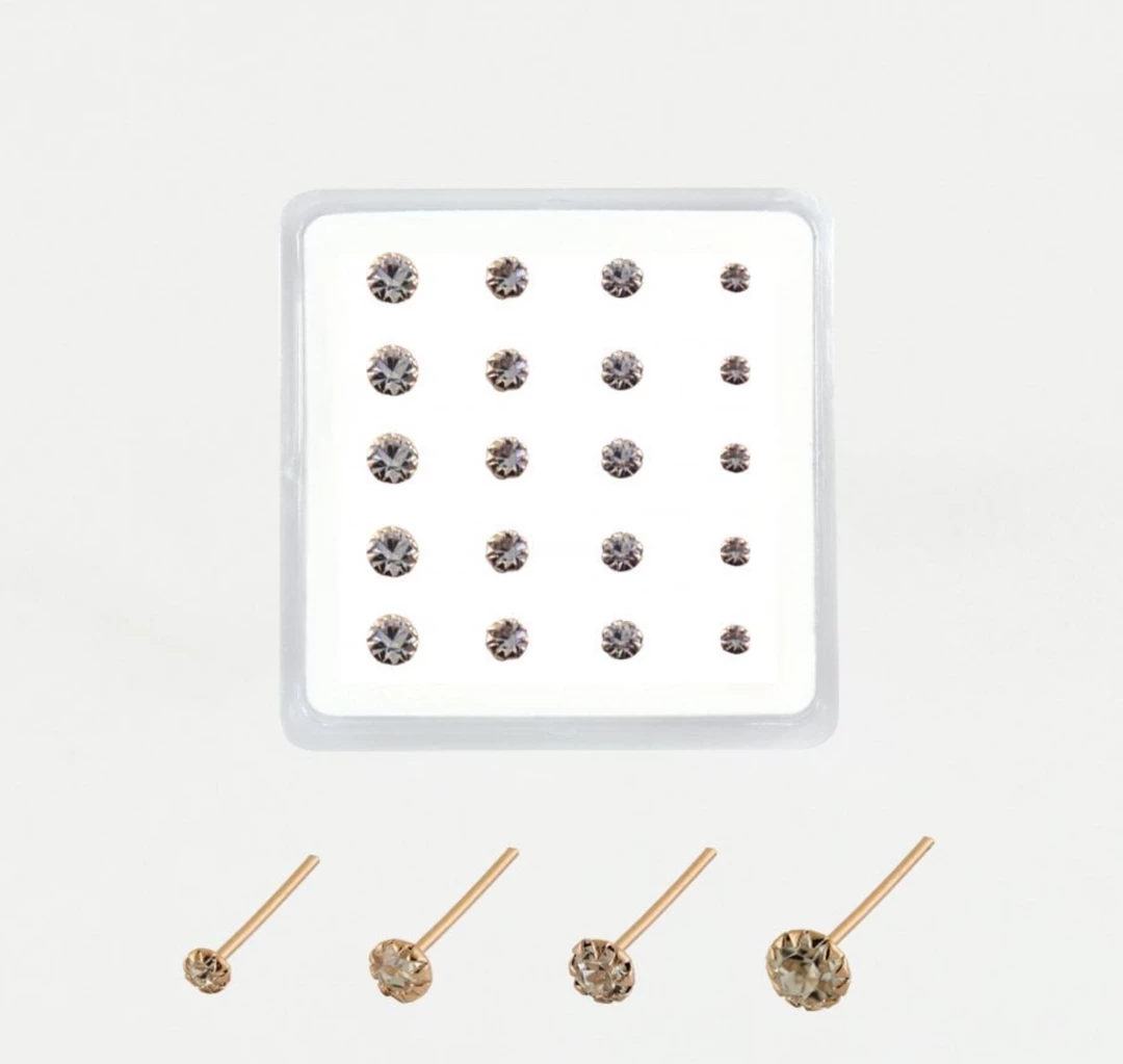 Square clear gem nose pins in Gold plated Sterling Silver. These nose pins have a straight back and are available in four sizes