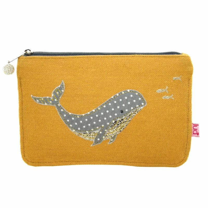 New large curved purse with whale appliqued in cottons/metallic faux leather. Tiny metallic embroidered fish detail.