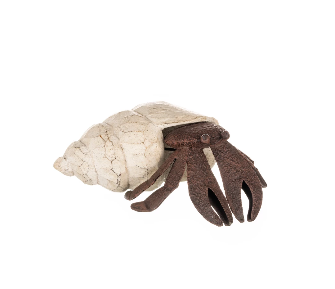 Henry the hermit crab is hand carved from wood with a rusty finish metal body