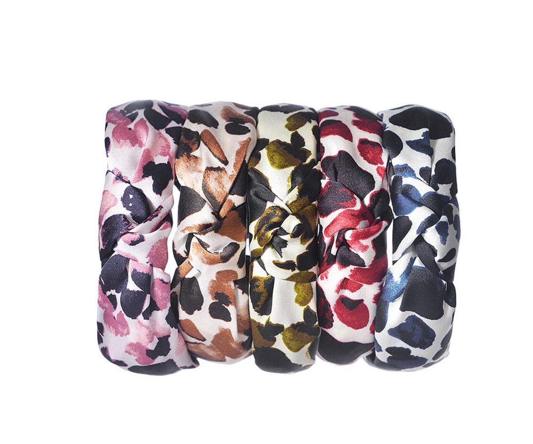 These new silky knot headbands in an abstract spot print are perfect for keeping those stray hairs off your face while looking fabulous too! Choose from 5 gorgeous colours!