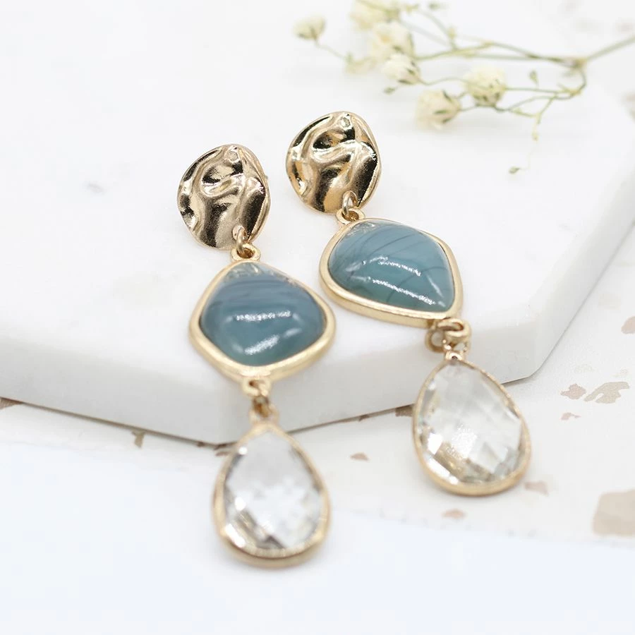 Gold plated triple drop earrings with a textured disc at the top, blue stones underneath and faceted clear crystal at the bottom