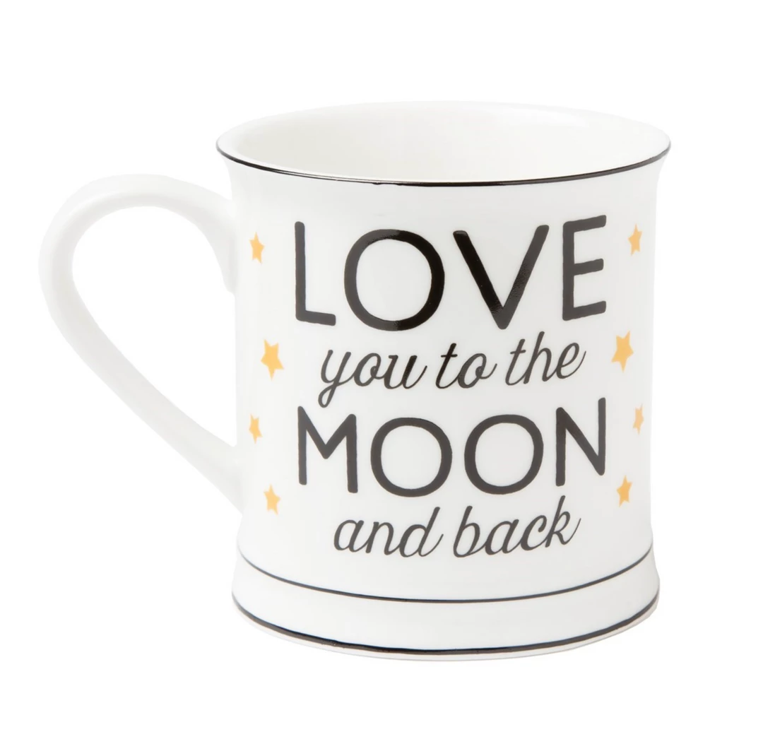 This classic-shaped mug features black and metallic gold details “Love You To The Moon and Back” A perfect gift for a loved one.