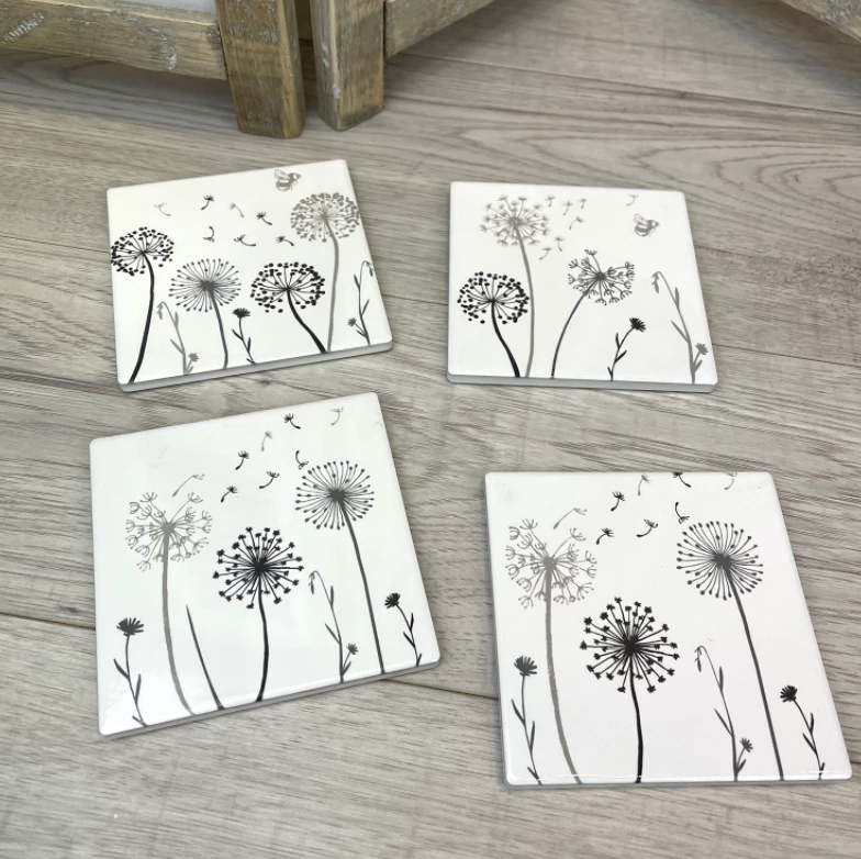 A gorgeous set of 4 ceramic coasters with dandelions and bees with a cork backing.
