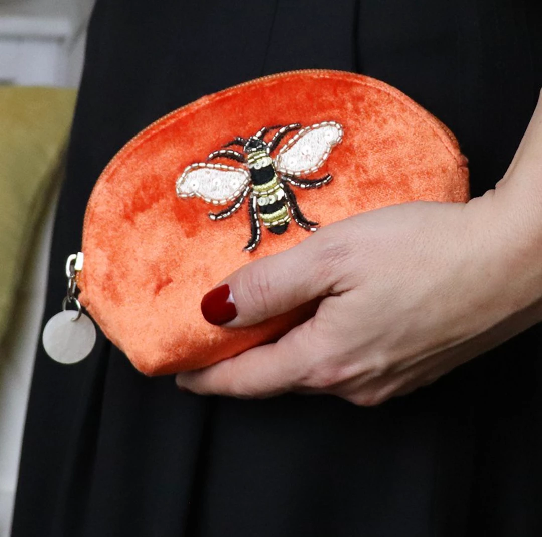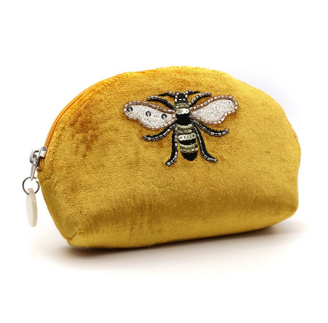 Velvet D shaped coin purse with embroidered bee. Perfect for coins, cards or lippy!