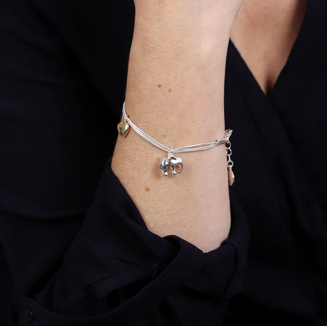 Silver plated triple strand snake chain bracelet with a golden heart charm and silver plated elephant with crystal eye.
