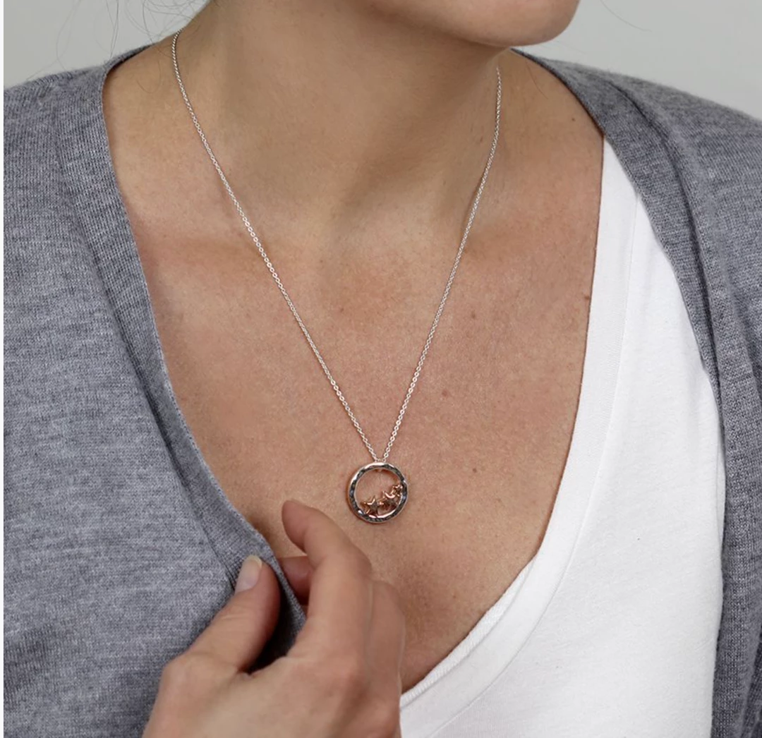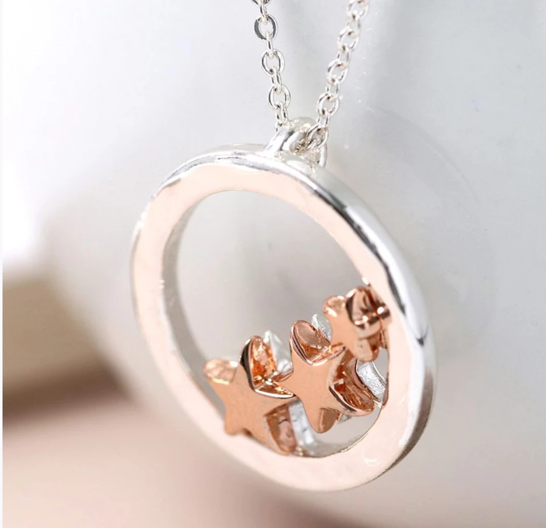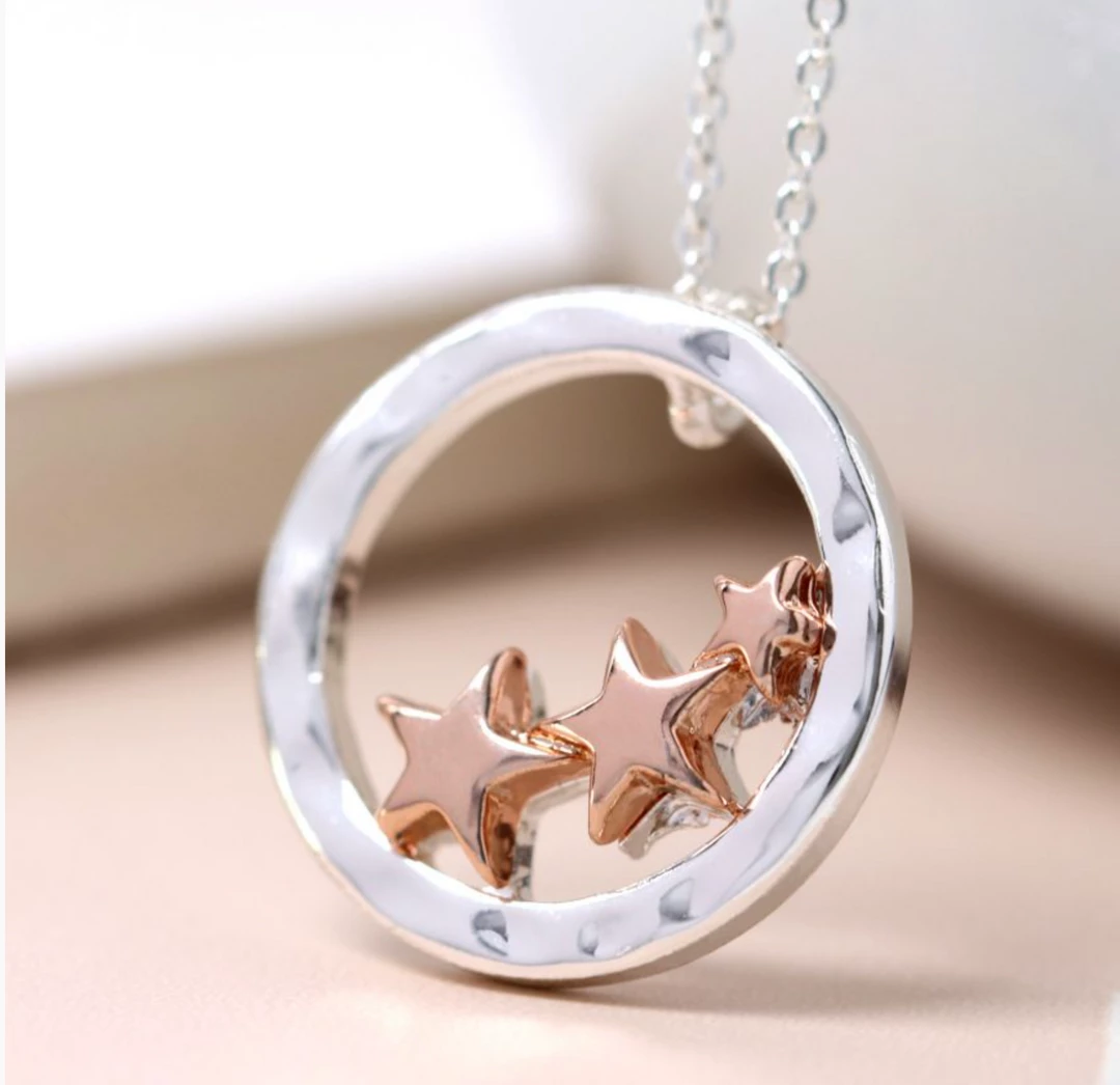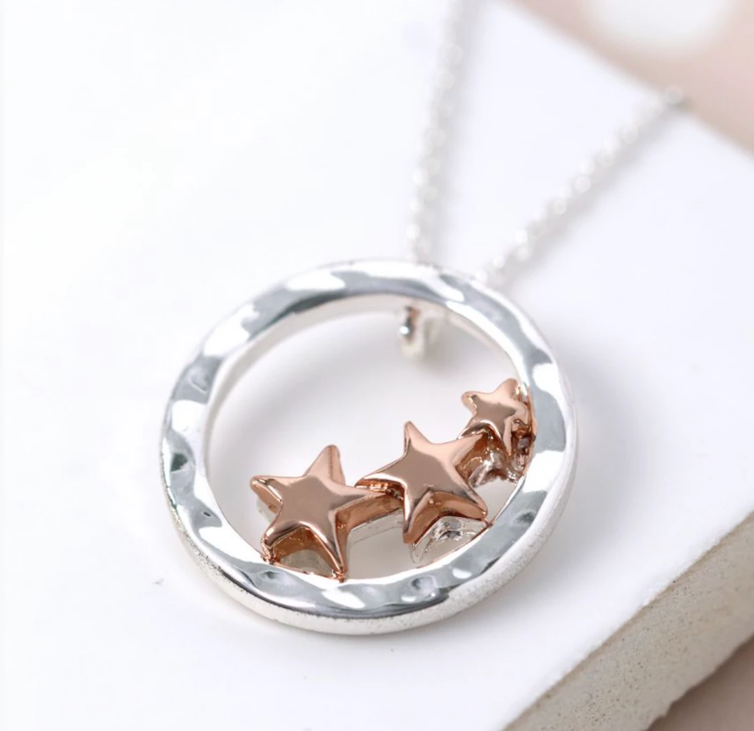 Silver plated fine chain necklace with a textured silver plated hoop and three rose gold style stars Chain length approx 18- 20″ Hoop Size approx 20mm