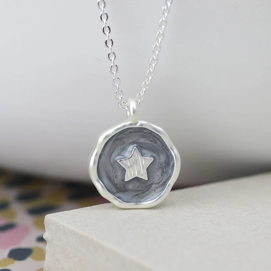 Pretty grey pearlescent enamel disc necklace with a silver star in the centre, irregular matching silver edge and worn silver plated finish.